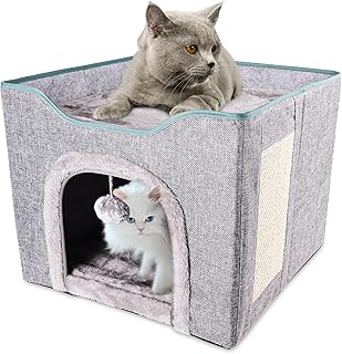 DEWEL 折りたたみ式 猫 ベッド 犬 ハウス ペット クッション ソファー 爪とぎ 二層 猫用 小型犬 多頭用 夏 通年 ふわふわ 組立簡単 お手入れ簡単 幅43 奥行43 高さ35.5cm